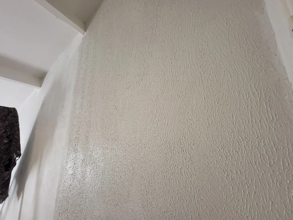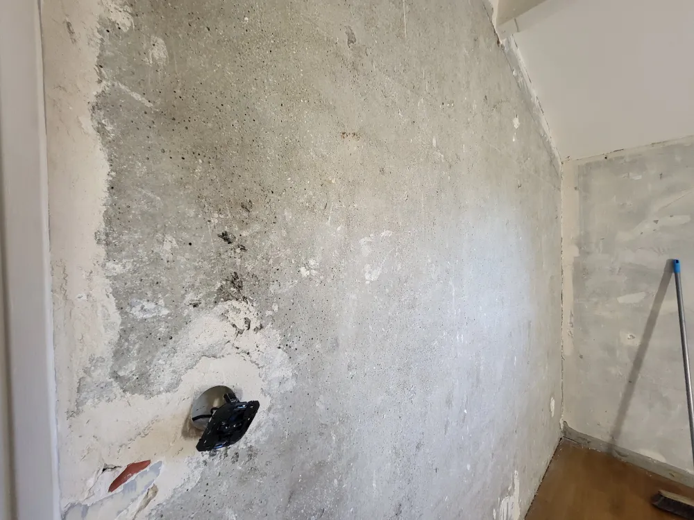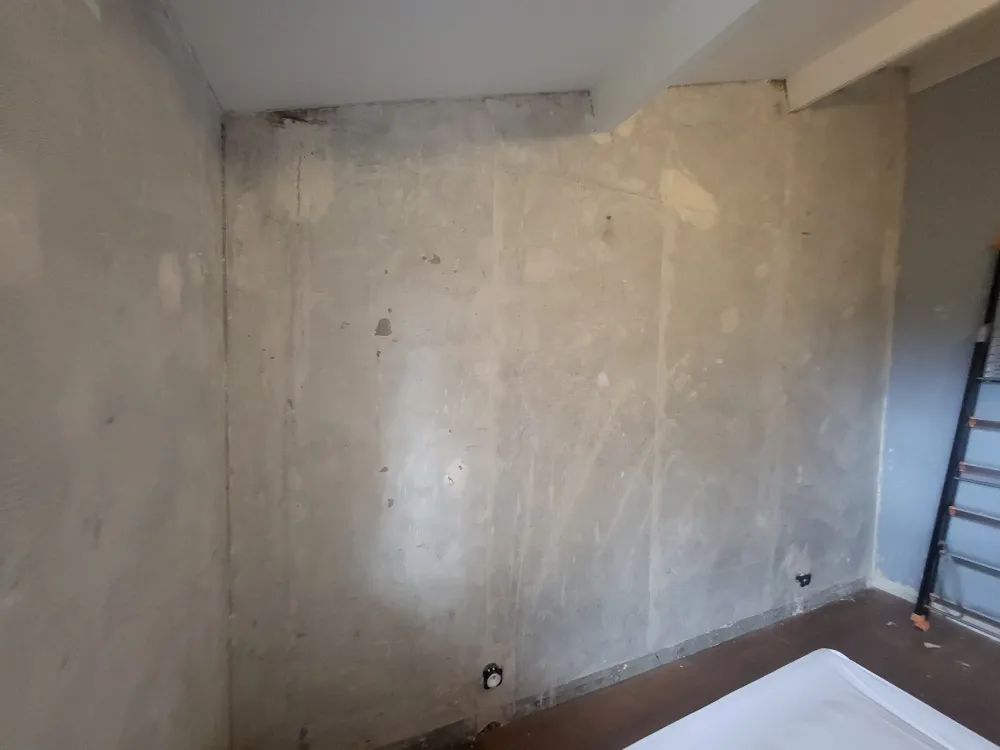 La rénovation a commencé par un ratissage à même sur la structure des murs en béton armé, nécessitant trois passes avec de l'enduit fin "Bagar". Ce procédé a permis de préparer les surfaces pour un résultat final impeccable. Un long travail de ponçage a ensuite été réalisé pour assurer une surface lisse et prête à recevoir les couches de peinture.